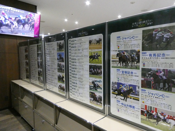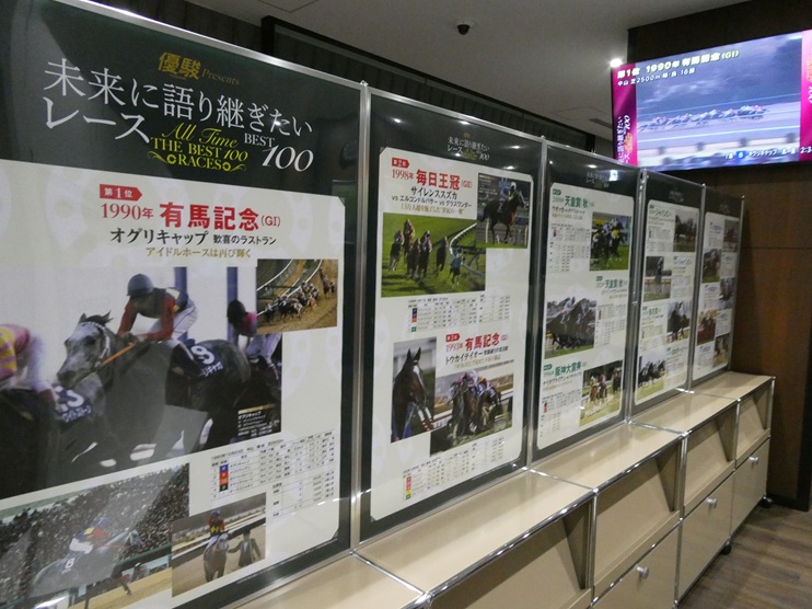 『優駿』2025年9月号に掲載された読者投票の結果をもとに選ばれた“語り継ぎたいレース”BEST100を、印象的なシーンを厳選した写真とともにパネルで紹介。